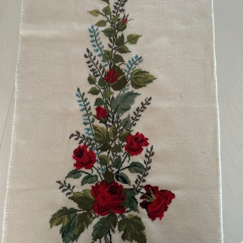 Vægbroderi / billede, Det fineste svenske dekorative broderi. Monteret på træplade til ophængning på væg. Måler 58 x 46 cm. Broderiet er udført på meget fint lærred og vil se godt ud i et sommerhus eller den svenske ødegård. Fin stand stand uden skader. Står på Mols men kan gratis leveres i Aarhus og Ebeltoft eller sendes billigt med GLS på købers regning