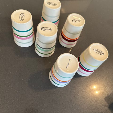 8 stk. Helbak kopper, 1 kande, 1 mælkekande og 1 sukkerskål sælges. Det hele fremstår i superfin stand, på nær 2 kopper hvor den ene har et lille skår på undersiden og den anden lidt aftegning i bunden, dog uden at være skåret. (Se se sidste 2 billeder).