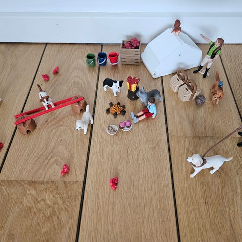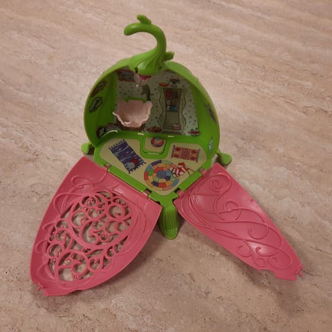 Schleich feernes legesæt med hus og tilbehør. Sættet består af et eventyrmiljø med fe-hus, bro, vandløb og forskellige små møbler og dekorationer. Der medfølger flere små dele som borde, stole, blomster og andre fantasielementer, der kan bruges til rolleleg i et fe-univers. Plastdele i flere farver, primært lyserød, grøn, blå og hvid. Velegnet som tilbehør til Schleich-figurer i fe- og fantasiserierne.