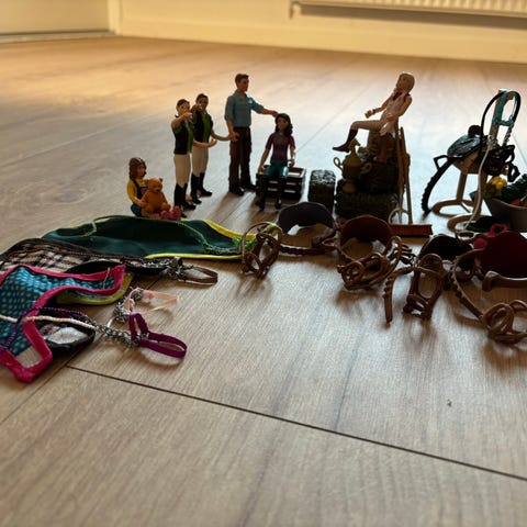 Der mangler føllet og kaninen/rotten samt et lyserødt tæppe og en gul sommerfugl.