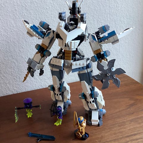 LEGO NINJAGO mech sæt. Sættet indeholder en stor hvid og guld mech-robot med bevægelige arme og ben samt flere sværd og tilbehørsdele. Der medfølger flere minifigurer med våben og udstyr.