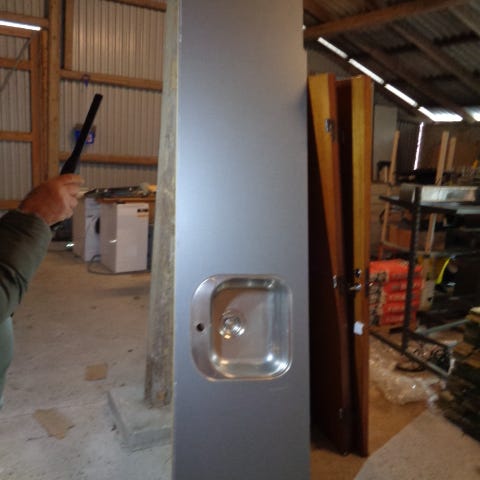 Rustfri bordplade med stor vask, armatur og ophæng