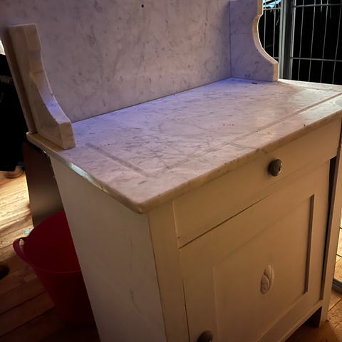 Fin gammelt servante-skab / sengebord i maghoni med gråmeleret marmorplade