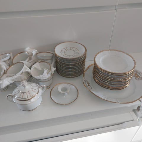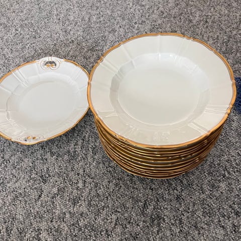Fint spisestel med guldkant af 24 karat guld. Består af flg. enheder: 14spisetallerkener, 12 dybe tall., 16 frokosttall., 15 sildetall, 1 stort ovalt fad, 1 kartoffelskål, 1 lågfad, 2 sovseskåle, 3 ovale fade, 1 trekantet fad, 2 ovale småfade, 2 ovale assietter sælges samlet, meget fin stand.