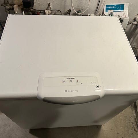 Electrolux SpacePlus LowFrost kummefryser i hvid. Fryseren er udstyret med LowFrost-teknologi, som reducerer mængden af rimdannelse indvendigt. Den har flere trådkurve til organisering af indholdet og et rummeligt fryserum under kurvene. Låget åbnes opad, og betjeningspanelet sidder på fronten med indikatorlamper for drift og alarm. Velegnet til opbevaring af frosne fødevarer i eksempelvis bryggers, kælder eller lagerlokale.