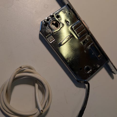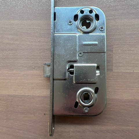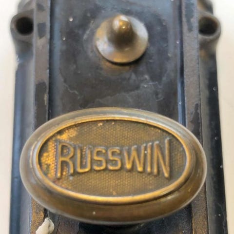 Russwin dørkasselås med udvendig cylinder og tilhørende nøgle. Låsekassen er overflademonteret og egner sig til montering på dørens inderside. Med mekanisk falle og drejeknap på indersiden. Cylinder og nøgle er i metal/messing-look. Velegnet til ældre døre eller som reservedele til eksisterende Russwin-låsesystem.