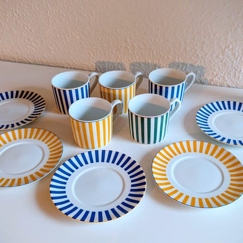 Fem kopper og fire underkopper fra Louis Lourioux, model Irma, fra 1976. Fremstillet i England.