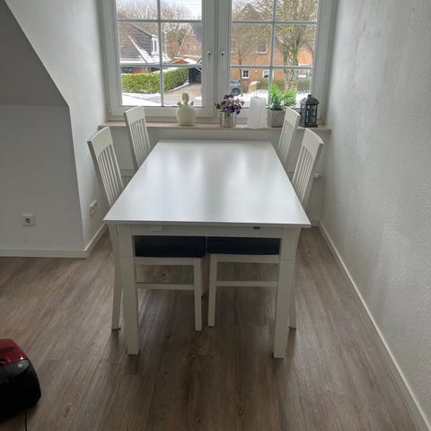 Fint hvidt spisebord med hollandsk udtræk. Kan blive 215 med fuldt udtræk.