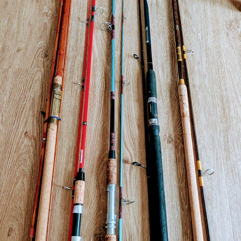 Alle er vintage stænger i glasfiber. Stængerne varierer i mærke, design, størrelser, håndtag og opbygning og er beregnet til brug som reservedele til egne fiskestang byggeprojekter.