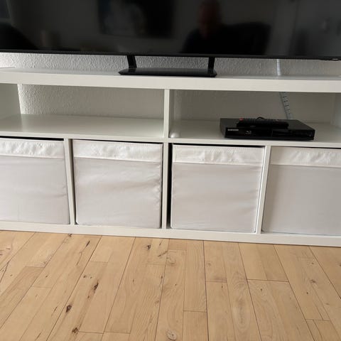 Hvidt tv-bord fra ikea, med metal og glas hylde.