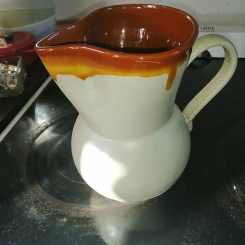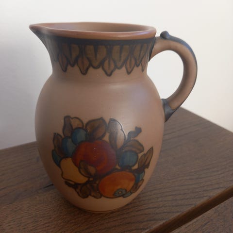 Kanden er udført i stentøj med flerfarvet glasur i nuancer af blandt andet brun og beige.