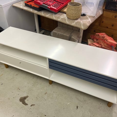 Original Mistral TV/medie reol møbel i bøg fra Hammel Møbelfabrik/Ilva. Den har synlige brugsspor som vist på billeder men ellers robust. Der er to huller i bagpladen. Reolen har 4 skuffer og er væghængt. Ophæng medfølger og kan afhentes i 5000 Odense C, eller alternativt afhentes i 4293 Dianalund