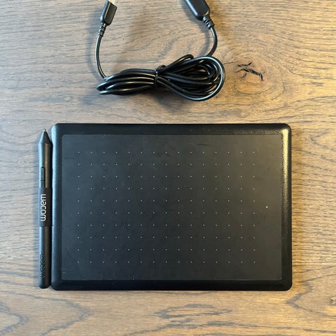 Wacom tegneplade med pen i sort. Enheden tilsluttes via kabel og kan bruges til digital tegning, illustration, fotoredigering og anden præcis pege- og skrivefunktion på computer. Leveres med tilhørende pen og kabel som vist på billederne.