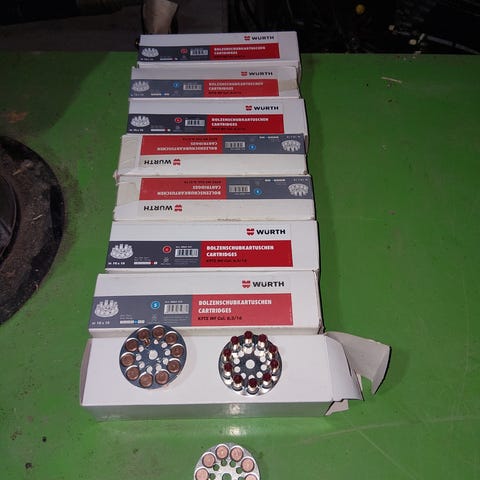 Würth magasinerede uni-patroner til tekniske formål i cal. 6,8/11 M. Patronerne leveres i plastmagasiner med forskellige farver og styrker, herunder grøn (styrke 3), rød (styrke 5, stærk) og gul (styrke 4, middel). Velegnet til brug i kompatible værktøjer, hvor der kræves magasinerede patroner til fastgørelse eller lignende tekniske opgaver. Oplysninger om antal styk pr. æske og præcis anvendelse fremgår af emballagen.