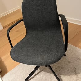 IKEA kontorstol i gråt stofbetræk. Stolen har integrerede armlæn og sort drejefod med fire ben. Sædet er formstøbt med høj ryg for fuld rygstøtte. Højde kan justeres via håndtag under sædet. Egnet som kontor- eller arbejdsstol i hjemmet eller på kontor.