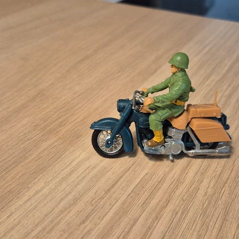 Dette eksemplar er sjældent velbevaret - styret, støttebenet og alle små dele er helt lige og intakte. Malingen er holdbar og ridsefri, hvilket gør den ideel til seriøse samlere af militære miniaturer og vintage legetøj