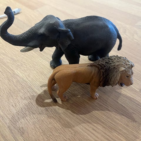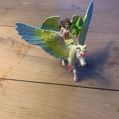Schleich fantasifigur med bevinget løve og fe. Figuren forestiller en løve med store vinger og en fe med vinger, der sidder på ryggen af løven. Detaljeret plastikfigur med flere farver, egnet til fantasifuld leg og som samlerfigur. Figuren kan kombineres med andre Schleich dyr og figurer i samme serie.