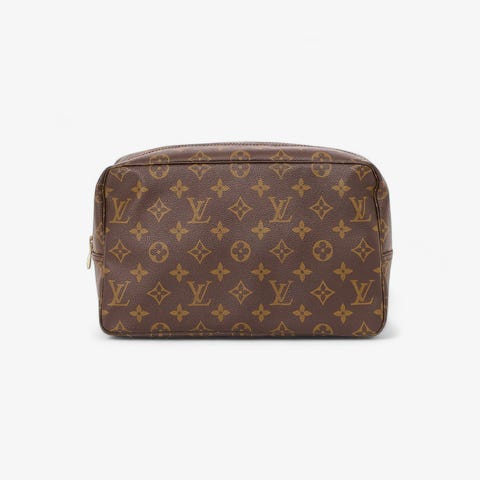 En stilfuld og funktionel Poche Toilette i Louis Vuittons ikoniske Monogram canvas med sort koskindslæder og guldfarvet lynlås.