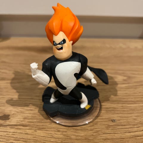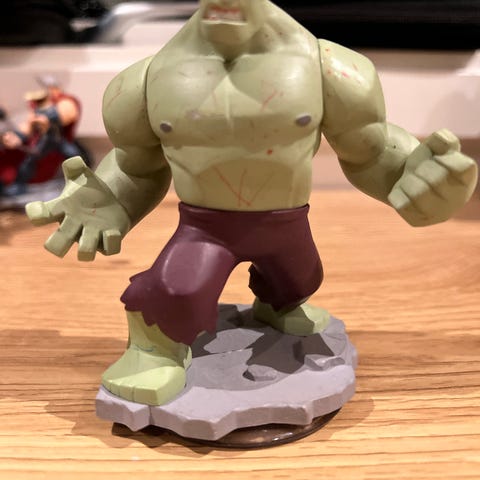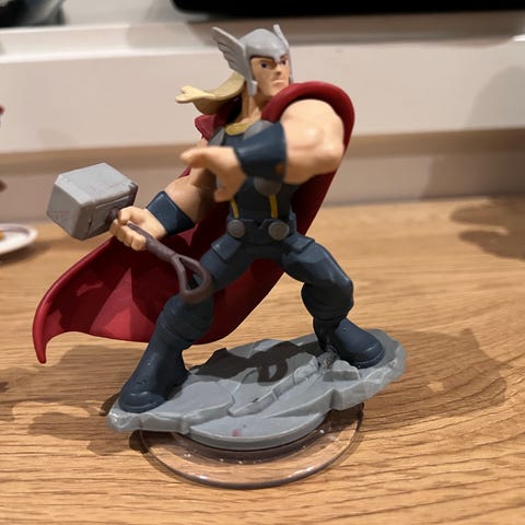 Disney Infinity Thor power disc i blå sekskantet plast. Brikken viser figuren Thor på forsiden og har blå bagside med trykte specifikationer. Anvendes som ekstra indhold i Disney Infinity-spillet ved placering på portalen.