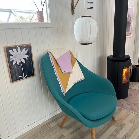 About lounge chair. Lav model designet af Hee Welling. Monteret med lysegråt uldstof