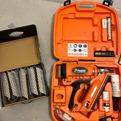 Paslode IM65 F16 sømpistol i plastkuffert. Sættet indeholder sømpistol, gaspatron, batterioplader og tilbehør som vist på billederne. Velegnet til sømning af lister og lette trækonstruktioner, hvor der anvendes F16 søm. Leveres i robust orange transportkasse med brugsanvisning i låget.