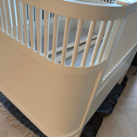 Sebra tremmeseng i hvid. Klassisk tremmeseng med afrundede hjørner og tremmer hele vejen rundt. Sengen har perforeret sengebund i træ for ventilation. Egnet til spædbørn og småbørn som sovemøbel på børneværelset. sælges uden madras og tekstiler.