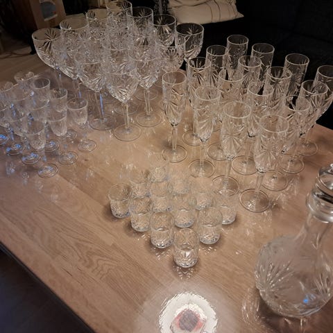 Glassene er brugte og har derfor almindelige brugsspor, men de fremstår stadig flotte og pæne og kan sagtens holde i mange år endnu ved normal brug. Der er 1-2 glas, som har fået et lille mærke under en flytning. Det er meget minimalt, ses kun hvis man kigger efter det, og de er stadig helt intakte – man kan ikke skære sig på dem.