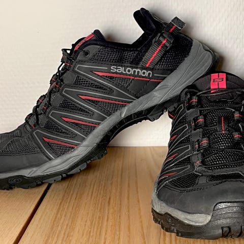 Brugt 2 gange til korte gåture. Nypris 1350 kr. Har desværre fået smidt de originale indlægssåler ud, da de var meget tynde. Har nu lagt tilsvarende helt nye såler i.
