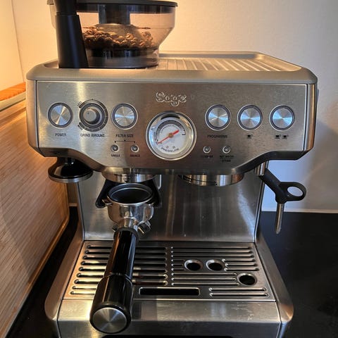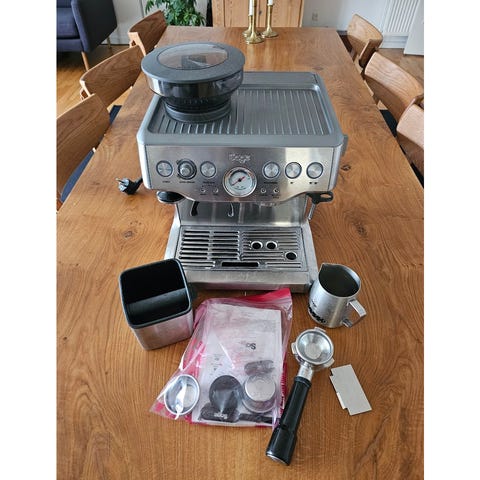 Sage espressomaskine med indbygget kaffekværn i rustfrit stål. Maskinen har digitalt display på fronten til indstilling af bryggefunktioner og programmering. Indbygget kværn i toppen til friskmalede bønner direkte i filterholderen. Dampstav i siden til opskumning og opvarmning af mælk. Drypbakke og koprist i bunden samt opbevaringsplads til tilbehør. Velegnet til tilberedning af espresso, cappuccino og andre kaffedrikke i hjemmet.