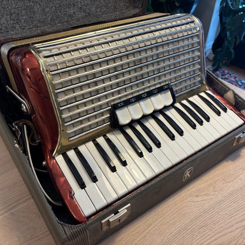 Hohner harmonika Riviera 2 i sort med træfarvet sidepanel i original kasse med 96 basser. Instrumentet har knapper på diskantsiden og bærestrop. Medfølgende hård kuffert i grå farve med håndtag. Velegnet som knapharmonika til øvelse og spil i hjemmet eller til transport med den medfølgende kuffert.