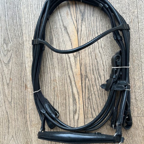 Hovedtøj str. Full rundsyet sort læder med webtøjler.
