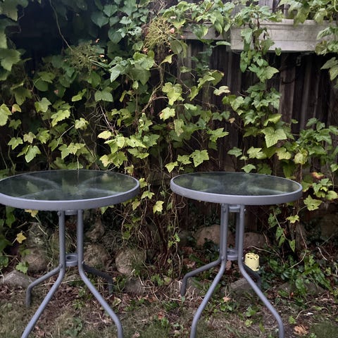 Cafésæt bestående af rundt bord og to stole i metal med sort finish. Bordet har rund bordplade i sort glas og metalstel med tre ben. Stolene har metalstel med armlæn og sæde/ryg i netlignende materiale. Egnet til altan, terrasse eller lille udendørsområde. Sættet er pladsbesparende og kan anvendes til fx caféhjørne eller mindre spiseplads udendørs.