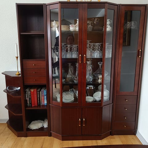 Skønt lille mahogniskab med hylder, to skuffer og fine perlemors beslag (mangler på øverste skuffe) 🌟