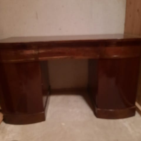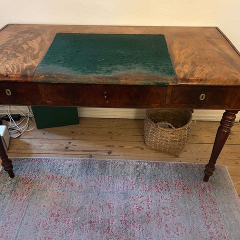 Smuk gammel skrivebord af massiv træ med fine detaljer, men også med synlige brugsspor, gives væk gratis, kun til selvafhentning