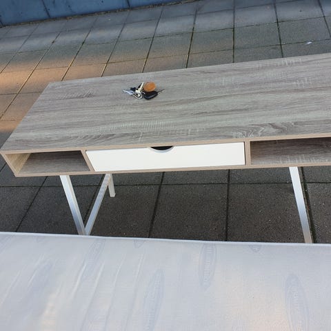 Fint gammelt vinkel skrivebord med to skuffe elementer.