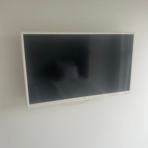 TCL fladskærms-tv i sort. Vægmonteret model med slankt design, egnet til brug i stue, soveværelse eller kontor. Tilslutning af eksterne enheder som tv-bokse, medieafspillere eller spillekonsoller via relevante porte på bagsiden (ikke vist i detaljer på billederne). Velegnet til almindelig tv-brug og streaming ved tilslutning af kompatible enheder.