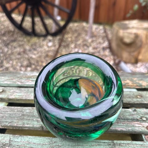 Oldemors flotte gamle glasskål, der står på små fødder. I lys blåt glas.