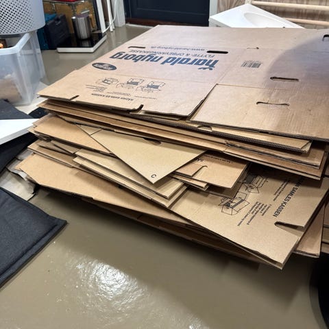 Flyttekasser i pap. Egnet til opbevaring eller flytning af indbo og andre genstande. Kassernes præcise antal og mål fremgår ikke, men de er sammenklappede og klar til brug efter opsætning.