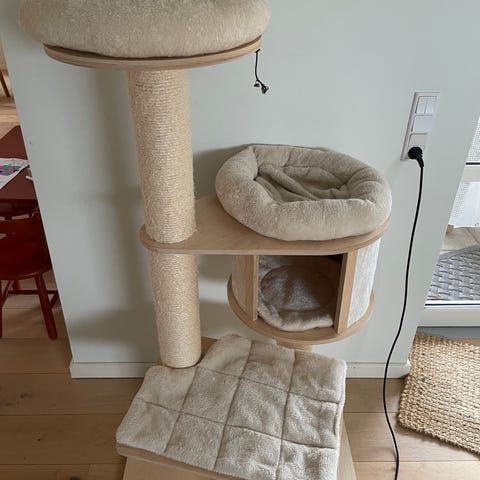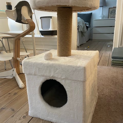 Kradsetræ og kattehule i ét møbel med blød, grå plysovertræk. Øverst er der en polstret liggeplads med lys liggeflade. Foran er der en indgang til en lukket hule til katten. På siden er der et aftageligt kradsebræt med sisal samt en lodret kradsepæl i sisal inde i møblet. Egnet som hvile- og lejestation til katte.