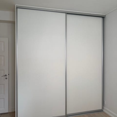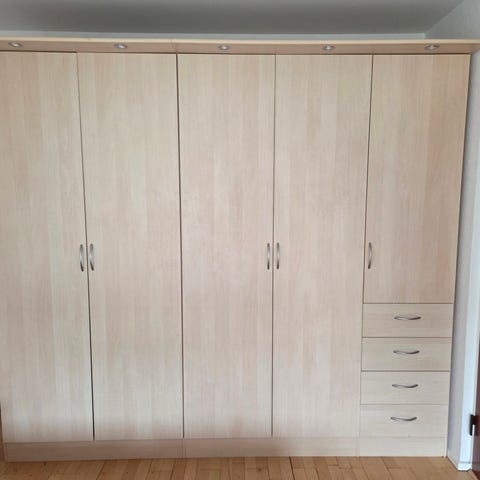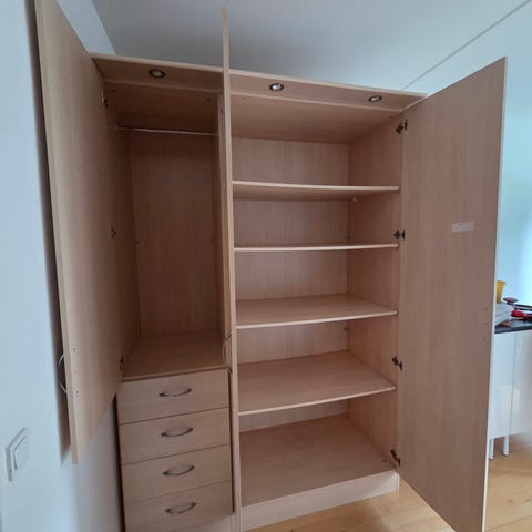 Børneskab med hylder og 2 bøjlestænger. Fremstår med brugsspor, trænger til ny maling udvendigt. Lukkes med hængsel. Nøgler haves ikke. Står skilt ad og skal bæres ned fra 1.sal. Skabet er tungt.