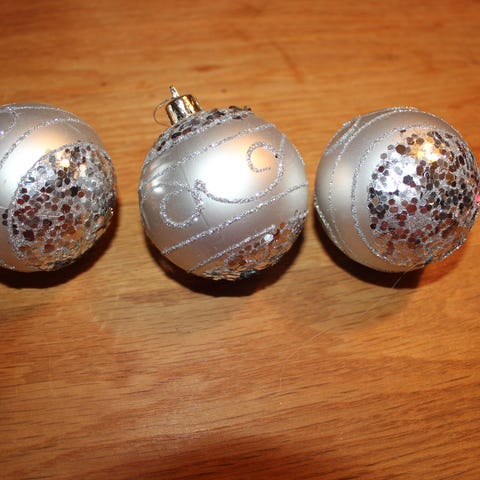 Sæt af julekugler i farverne rød, sølv Kuglerne har forskellige overflader og mønstre. Velegnet til juledekoration.