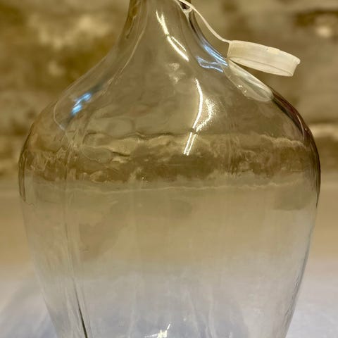 Vinballon i klar glas, formentlig 25 l. med træramme - til opbevaring eller til dekorative formål. Hvis det er til vinbrygning, så bemærk at denne ballon har en stor åbning, afsluttet med gevind/skruelåg.