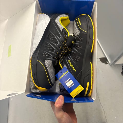 Jeg sælger disse Goodyear Sikkerhedssko i størrelse 43. De har kun været brugte en enkelt gang i et par timer. Ellers har de bare lagt i kassen i et par år.