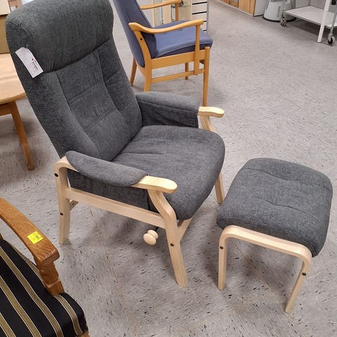 Stolen har et polstret ryg- og siddeområde med en blød overflade. Den har også armstøtter og en fodskammel i samme farve.,Afhentes i:,Røde Kors Bellinge (461),Bemærk at mail, chat og beskeder ikke besvares, og varen skal købes på knappen "Gå til varen"