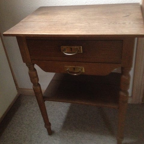 Møblet er en antik skrivebord med fire skuffer og en klap. Det er lavet af lyst træ med en poleret overflade. Nogle detaljer er udsmykket med metalbeslag.,Afhentes i:,Røde Kors Egå (751),Bemærk at mail, chat og beskeder ikke besvares, og varen skal købes på knappen "Gå til varen"