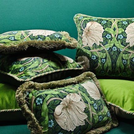 Pudebetræksæt lavet af stoffet "Amstel Cacadou" fra Mercis, et pragtfuldt trykt fløjelsstof og broderet silke fra Jane Churchill. Bagsiden på alle puder er samme farve som forsiden for at give ensartethed.