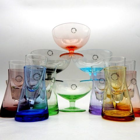Sæt på seks tropiske glas og seks tropiske skåle, håndlaveret af V.Nason&C i Murano-glas, Veneto, Italien; glasene er 19 cm høje og 4 cm i diameter, skålene er 6 cm høje og 12 cm i diameter; farverne er krystal for glasene og blå for skålene. Klik på den blå "gå til varen" knap, for at købe eller byde på denne vare. Den samlede pris vil blive vist inden du afgiver dit bud.
