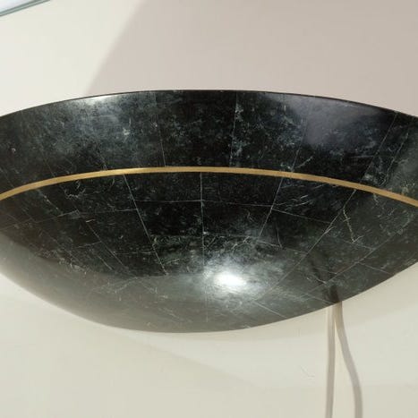 Denne lampe består af mørkegrøn keramik, messing og forgyldt metal.