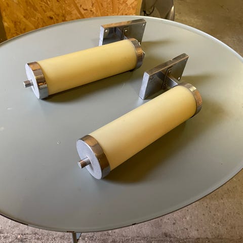 Et sæt vintage kromvæglygter fra 1980’erne, fremstillet i Frankrig, i fremragende stand og i funktion; størrelse bredde 37 cm, dybde 14 cm, højde 80 cm, egner sig til E14-pærer. Klik på den blå "gå til varen" knap, for at købe eller byde på denne vare. Den samlede pris vil blive vist inden du afgiver dit bud.