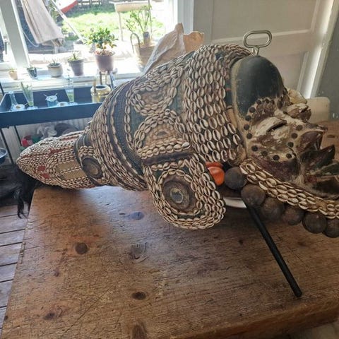 En meget udtryksfuld maske på en specialfremstillet stand.